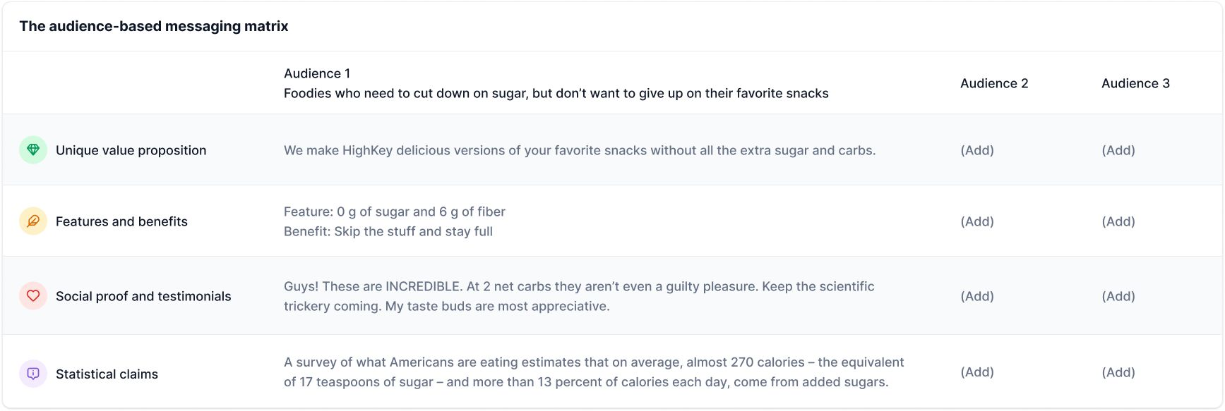 For example, the quotes above may appeal to foodies who need to cut down on sugar but don't want to give up their favorite snacks. Keep looking for other relevant segments you can build messages around.
