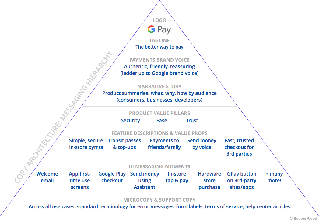 As you move up the pyramid, you'll find the product's core values and value propositions.